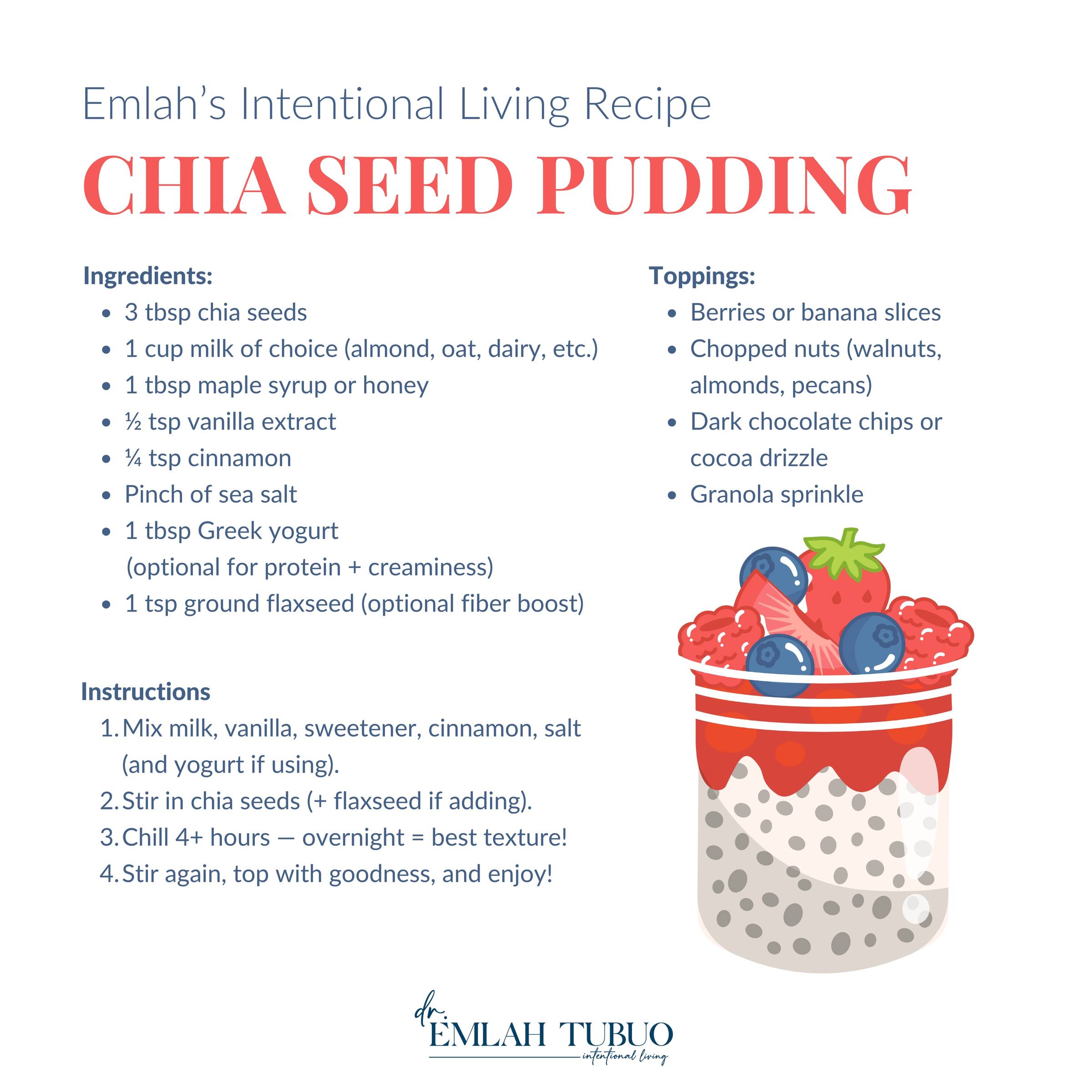 One of my favorite fiber-packed staples is chia seed pudding. It checks every box: high fiber, heart healthy, blood sugar supportive, omega-rich, and simple to make. My kids are obsessed and if that isn’t proof enough, even our pharmacy manager’s 1- and 3-year-olds devour it. When toddlers approve your recipe, you know you’ve hit gold.